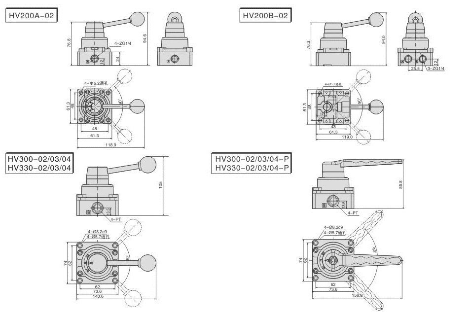 HV Series Hand Lever 4 Ports 3 Position Control Mechanical Valve Port size G1/4" G3/8" G1/2"